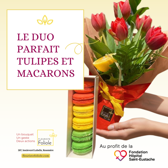 Cette année, une collaboration unique est née entre Fleuriste Foliole de Rosemère et la Fondation Hôpital Saint-Eustache. En ce moment, et ce, jusqu’à la fête des Mères, un ensemble exclusif « Duo tulipes et macarons » sera offert en ligne.