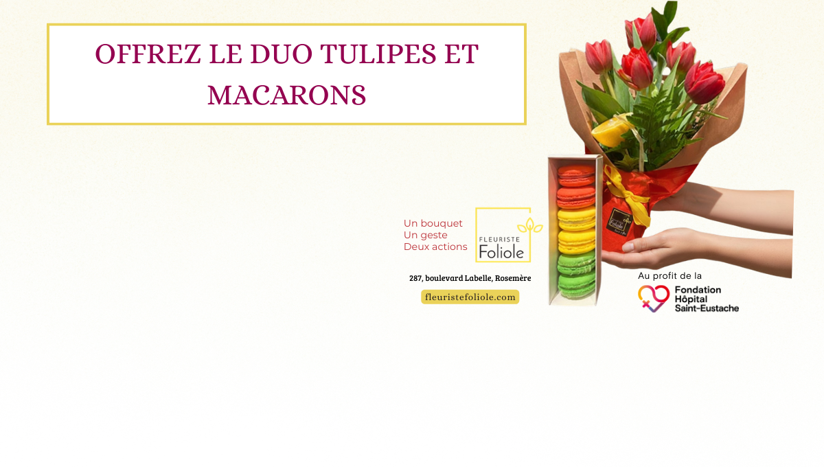 Cette année, une collaboration unique est née entre Fleuriste Foliole de Rosemère et la Fondation Hôpital Saint-Eustache. En ce moment, et ce, jusqu’à la fête des Mères, un ensemble exclusif « Duo tulipes et macarons » sera offert en ligne.