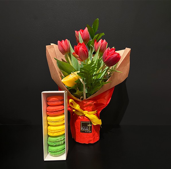 Le Duo tulipes et macarons est idéal pour toutes les festivités : Saint-Valentin, Pâques, fête des Mères, anniversaires, ou simplement pour le plaisir d’offrir.