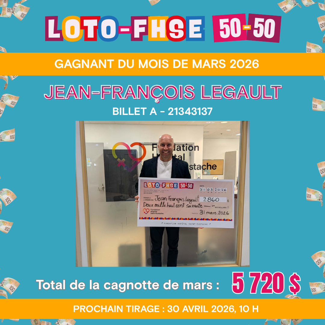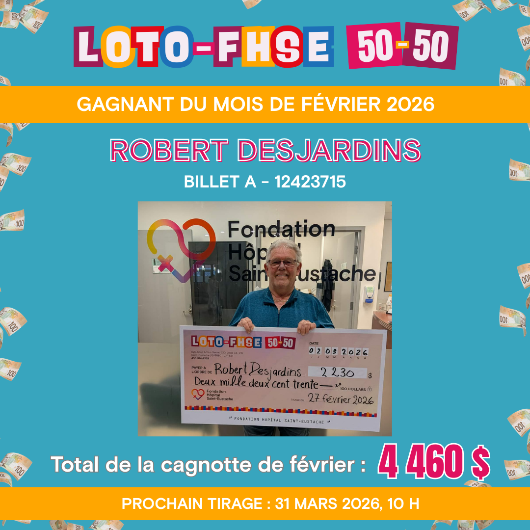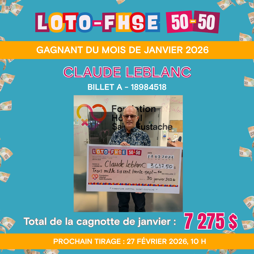 La nouvelle Loto-FHSE 50-50 est maintenant disponible en ligne pour que tout le monde puisse y participer facilement. En achetant vos billets, vous courez la chance de repartir avec la moitié de la cagnotte, tout en contribuant directement à financer des équipements à la fine pointe de la technologie pour l’Hôpital de Saint-Eustache et pour améliorer les soins offerts à l’Hôpital de Saint-Eustache.
