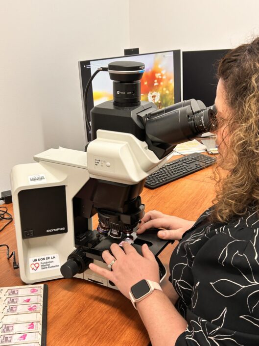 Sur la photo, Dre Valérie Leduc, pathologiste en pleine pratique.